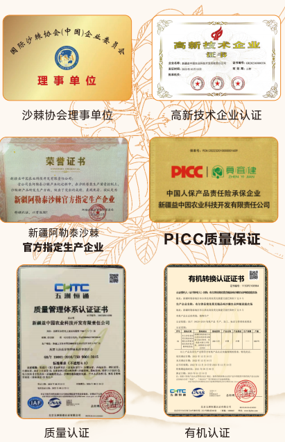 卓越的品质与严谨的管理,为真宜健赢得了广泛的权威认可与社会信赖。母公司不仅是国际沙棘协会的中国理事单位,其产品与生产体系还获得了高新技术企业、创新型企业等多项荣誉。更重要的是,新疆益中园已全面通过了ISO9001质量管理体系、ISO22000食品安全管理体系、HACCP食品安全认证等国际标准认证,为真宜健构筑起坚实的品质信任防线。