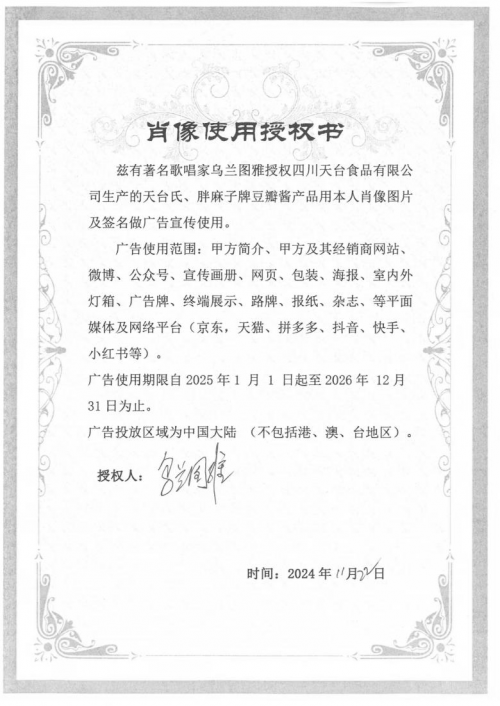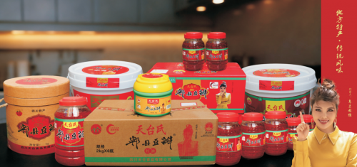 借势非遗特色,周文彬于2005年正式创立四川天台食品有限公司及特色品牌“天台氏”,将先辈的坚守转化为品牌化、规模化的发展之路,续写着郫县豆瓣的匠心故事。公司获得著名歌唱家乌兰图雅的青睐,授权其使用乌兰图雅肖像图片及签名做广告宣传,让这份蜀味豆瓣香,被更多消费者所熟知。