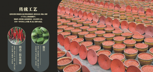 对传统工艺的敬畏,是天台氏郫县豆瓣不变的底色。选用四川、云南等地的二流板蚕豆,色泽新鲜无异味;精选川内产地的二荆条辣椒,红亮饱满、无霉变杂质,每一份原料都经过严苛筛选。遵循“盐渍辣椒成坯、蚕豆去皮制曲发酵六月成甜瓣子,再按比例拌入盐与面粉,经一年翻晒露发酵”的古法工序,不额外添加多余香料与油脂,全凭时间沉淀与精细工艺,成就浅褐红亮、酱脂香浓、鲜辣回甘的地道风味。