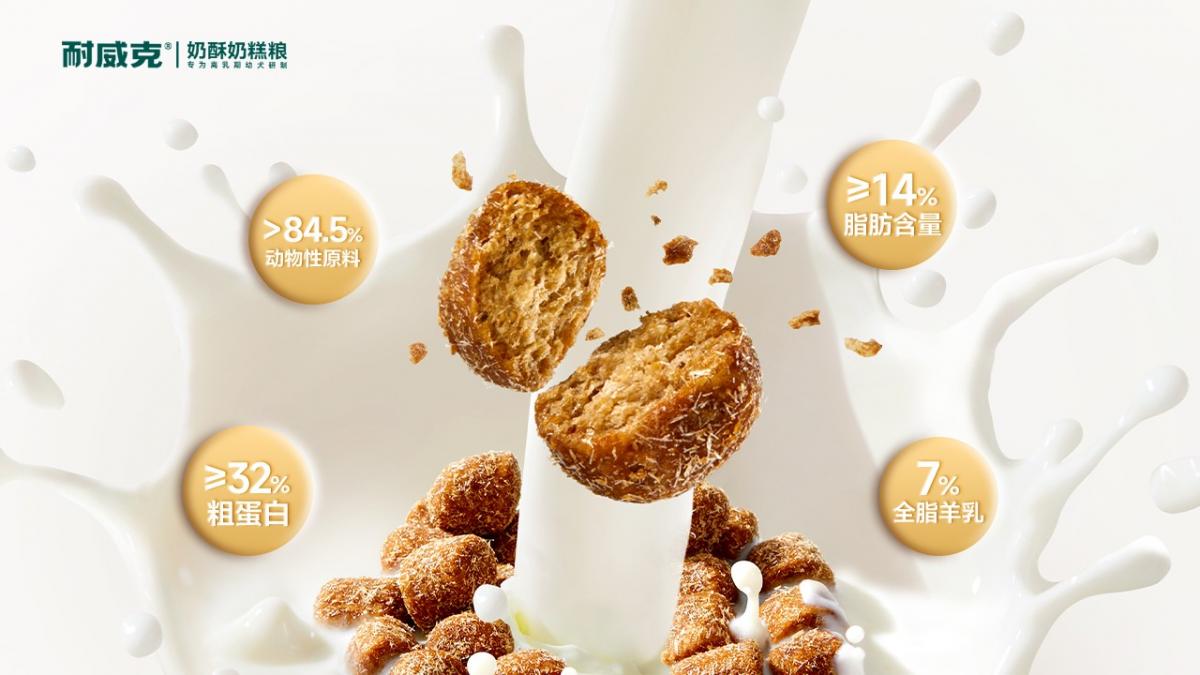耐威克首次明确提出“羊乳是酥化工艺的最佳搭配”的科学主张。羊乳中的脂肪球颗粒显著小于牛奶,更易于通过微孔结构被吸附和渗透,从而实现营养的“长驱直入”。同时,羊乳富含天然A2型β-酪蛋白,致敏性极低,可有效降低幼犬腹泻和过敏风险,真正实现“母乳级”喂养。